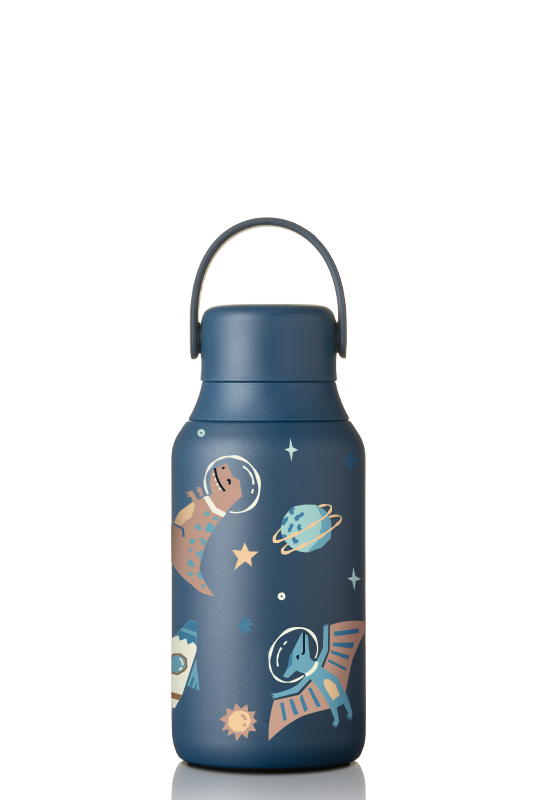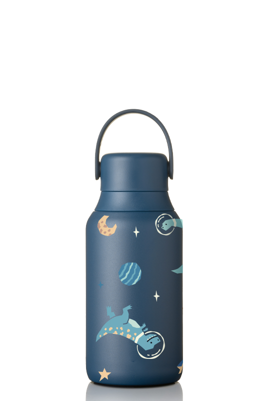 • Nowoczesna butelka termiczna w granatowym kolorze, z kolorowym dziecięcym nadrukiem z dinozaurami w kosmosie - wyróżniająca się innowacyjną ceramiczną powłoką antybakteryjną wewnątrz. Dzięki niej każdy łyk smakuje świeżo – bez metalicznego posmaku i bez przenikania zapachów